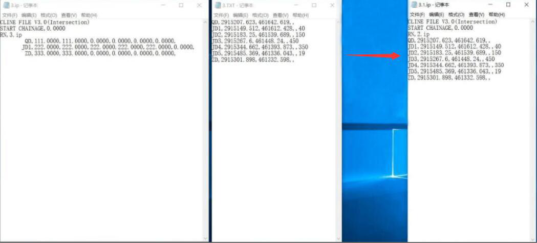 7、手簿连接电脑,将自己新建的道路设计文件剪切到电脑,用记事本的方式将它打开。再将第5步中的“*.TXT”记事本打开,将它里面的全部数据复制到新建的道路设计文件。