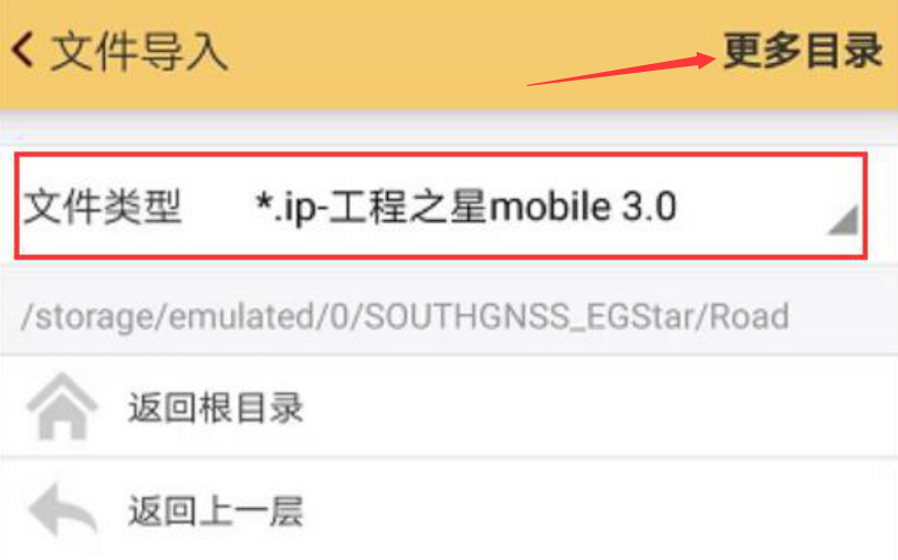 9、选择“*.ip-工程之星Mobile3.0”的导入格式。并点击其右上方的“更多目录”找到自己最后复制到手簿的道路设计文件,检查它的数据是否正确。