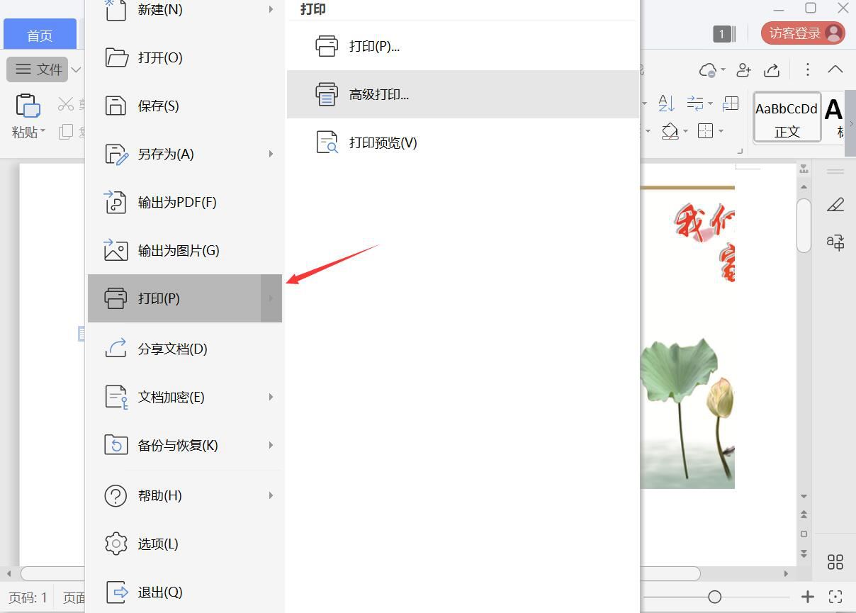 2、然后,打开要转换成PDF文件的Word文档。点击文档“文件”菜单中的“打印”,如下图所示。