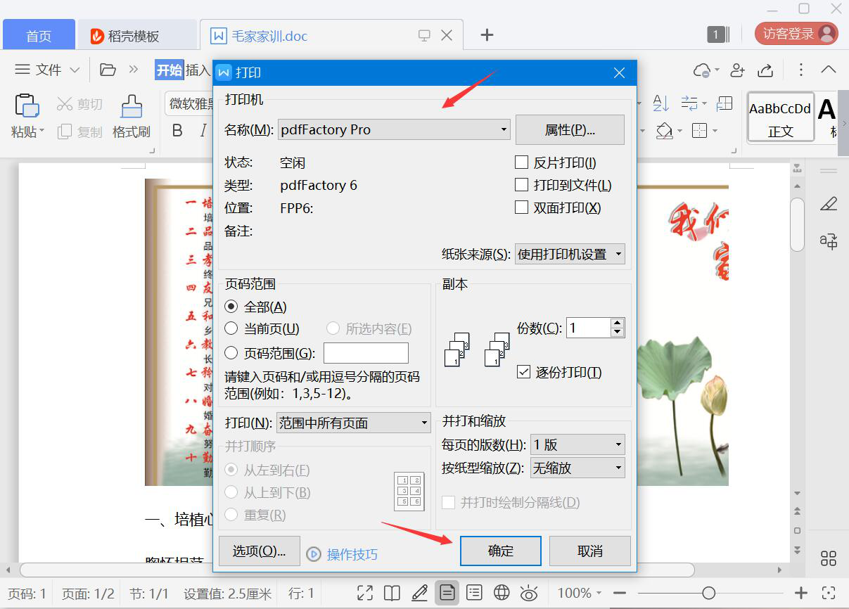 3、此时会弹出打印窗口,在打印机处选择“pdfFactory Pro”,再点击“确定”按钮。