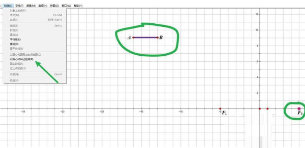 5、先点击焦点F2,再点击线段AB,然后点击菜单栏中的【构造】,在其下拉菜单中点击【圆心和半径绘制圆】。