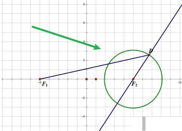 6、这样就会得到一个以F2为圆心,AB线段为半径圆。在圆上任取一点标记为D点,作直线DF2和线段DF1。