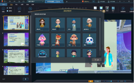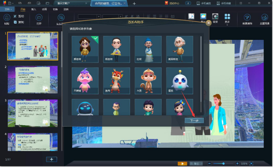 3.然后,在弹出的演翼AI功能助手中找到自己想要运用的PPT虚拟形象后,点击“下一步”按钮。例如,本文中的PPT是演讲今天说说合同的内容,所以,就选了女老师的虚拟形象。