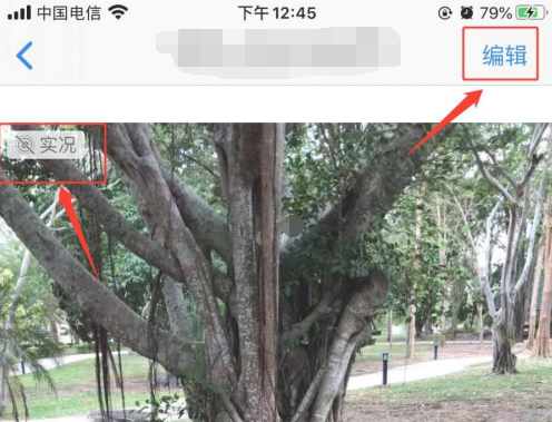 2.在打开的照片左上角“实况”是显示为关闭的,我们需要点击编辑