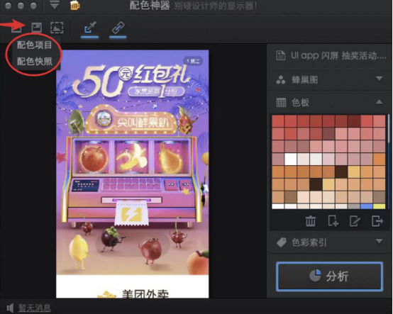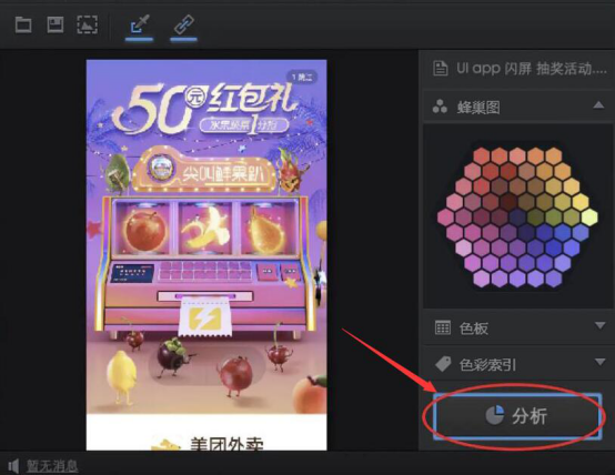 2.然后,点击Color Cube配色神器界面右下方的“分析”按钮,它便开始取色。例如就可以从蜂巢图中看到这个图片所有的颜色。