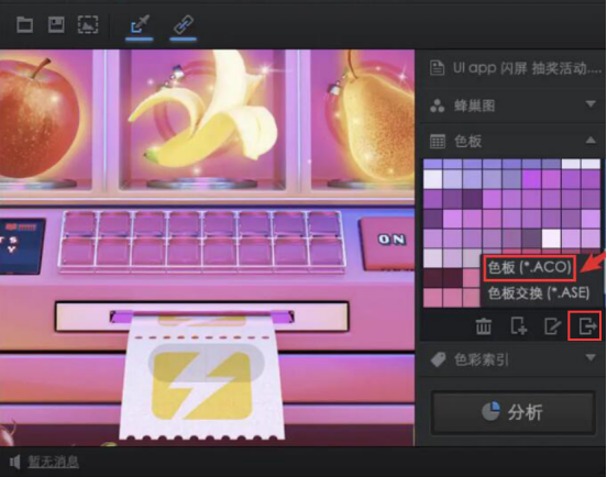 4.接下来,点击如下图的导出按钮,在导出菜单中,点击选择“色板(*.ACO)”,即可导出为ACO的格式文件。