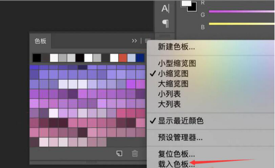 6.最后,如果用户是导出为ACO格式的文件,就可以打开PS,在PS的色板中,点击“载入色板”将这个ACO文件导入,结果,颜色就都能显示出来了。