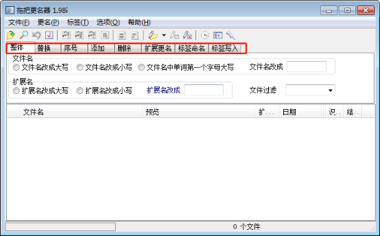 2、安装完成后打开拖把更名器,可以看到图中的【整体】、【替换】、【序号】、【添加】、【扩展更名】、【标签命名】、【标签写入】,这些是拖把更名器主要功能键。