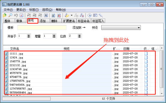 4、选择【序号】功能键,然后将需要重命名的图片直接拖拽到下方文件列表中。