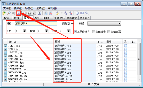 5、对序号功能键下的参数进行设置,在模板后文本框中输入【旅游照片#】,模板下方参数设置为“开始于【1】,增量【1】,位数【1】”;设置完成后,下方列表中的预览一栏中就会显示照片重命名之后名称,不满意的话可以随时修改模板后的文本框,都设置好之后点击上方工具栏中的【√】即可应用修改。