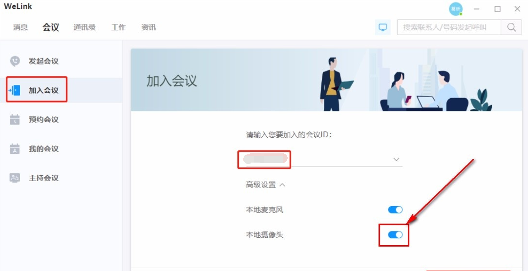 3.登录之后我们可以加入会议,或者远程视频等。输入会议ID之后就可以加入远程会议了,这时可以选择关闭本地摄像头开关,如需再次进入会议,可以打开开关。