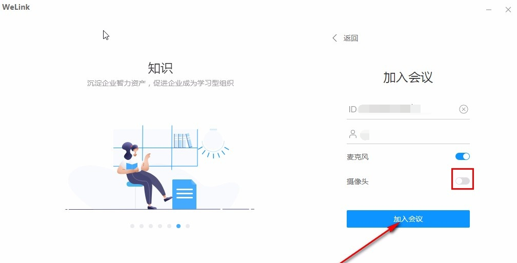 5.最后在加入会议的操作界面,同样的输入会议ID之后,我们将下方的摄像头这个功能开关给关闭掉再点击加入会议按钮即可。