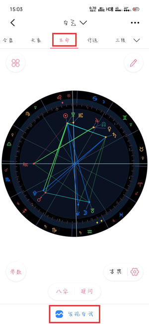 2.进入后默认查看到的为本命星盘,点击下方的【发现自我】进入查看本命星盘解读;