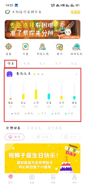 3.完成添加个人信息之后,在【首页】点击【今日】下方的运势进入详细运势页面;