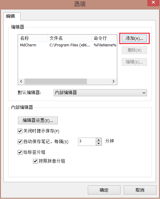 2、弹出选项窗口,点击编辑器右侧的【添加】。