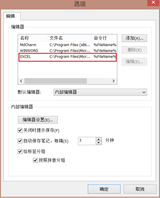 5、这样Execl编辑器就被添加到选项窗口中的编辑器列表中,点击【确定】。