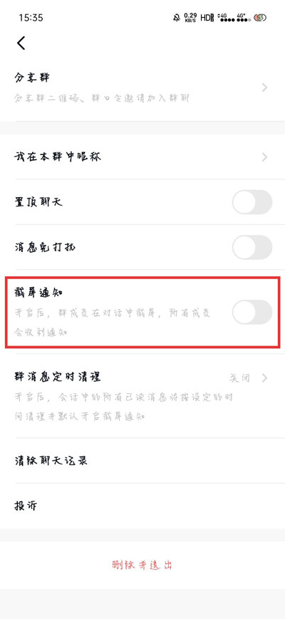 2.进入群聊设置页面后,下滑并开启【截屏通知】功能,开启之后,群成员只要在对话中截屏,所有成员就会收到通知;