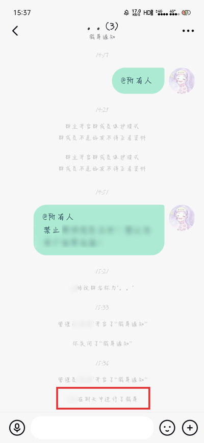 3.如果某个成员在群聊天中进行截屏了,那么群聊中就会提示“XXX在聊天中进行了截屏”;