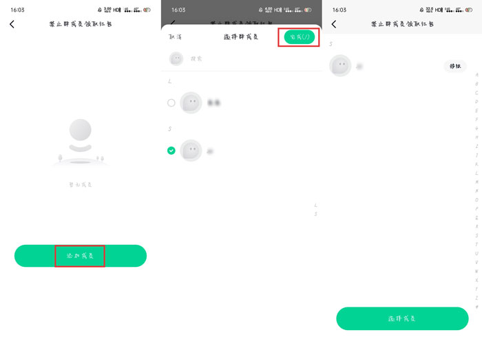 4.点击【添加成员】添加需要禁止抢红包的成员,选择该成员点击【完成】,然后就可以将该成员加入禁止群成员领取红包列表中;