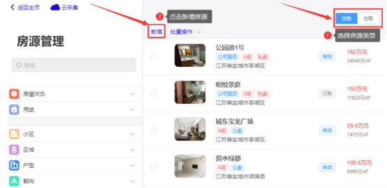 首先,我们来说说优毅优家的电脑端怎么新增和编辑房源。登录进入优毅优家操作界面。切换到“房源管理”页面。先选择房源的类型再点击“新增”。