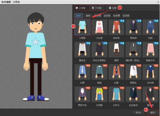 3.进入万彩骨骼大师的角色编辑界面,我们来为此静态人物角色应用我们想要头部、身体样式后,点击“确定”按钮。