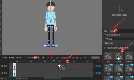 4.正面样式编辑完成后,接下来,我们开始让它动起来。点击界面右侧的“动作”,在万彩骨骼大师的动作库中挑选自己想要的动作,将它拖放到左侧的人物编辑区域的合理位置,再点击播放按钮,来看看静态人物角色动起来的效果。