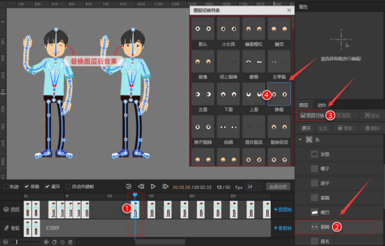 6.身体动作添加了之后,我们开始做它的面部表情。先将播放头位置置于图层帧上,再点选所需的图层,点击“图层切换”,并在其列表中找到想要的表情动作,单击它就可以应用到该静态人物角色了。也可以点击播放按钮来预览它动起来的效果。