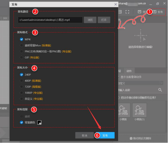 7.万彩骨骼大师将静态人物角色动起来后,我们可以点击“发布”按钮,设置发布时候的路径、格式、大小、背景,再点击“发布”按钮,即可我来教你给更多的好友了。或者也可以将它进行保存。