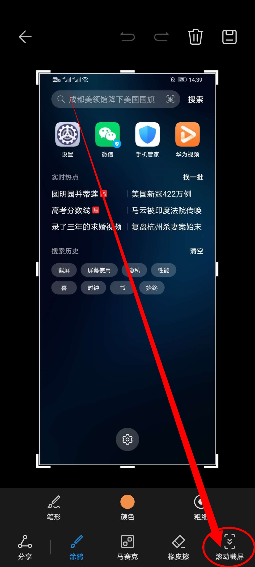 这个功能其实也就是长截屏,这里所说的是另外一种开启长截屏的方法,就是在你截屏成功之后,查看你所截图下方,会出现“滚动截屏”功能,点击之后也能开启长截屏。
