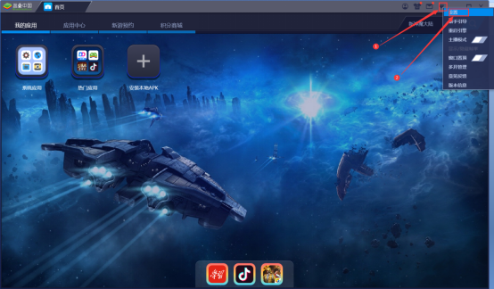 1、点击打开Bluestacks安卓模拟器,点击右上角下箭头图标(如图示①),在其下拉菜单中点击【设置】。