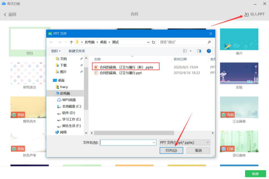 6.来到新建课件页面,点击界面右上方的“导入PPT”按钮,并在弹出的窗口中,找到自己另存为“*.pptx”格式的PPTX课件,点击“打开”按钮,将它导入希沃白板。