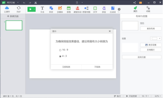 7.PPT课件导入希沃白板后,它会弹出如下图的提示,用户根据自己的需要选择画布比例,或者选择是否转换。