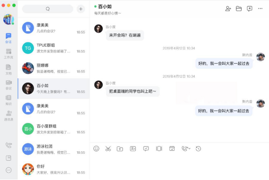 1.首先,和大家说说怎么用百度如流的会话功能。用户登录百度如流后,就会自动展开会话的界面。用户直接点选需要进行会话的同事,就像平时聊微信聊QQ那样发送消息即可。