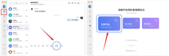 2.在使用百度如流的会话功能时,也可以点击会话窗口中的音视频按钮,选择“立即开会”、“加入会议”或者“预约会议”。