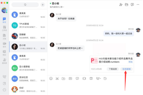 3.如果在用百度如流会话时,需要和同事们共同编辑一个文档,就可以发送该文档,大家点击“在线编辑”按钮即可快速进行编辑,而且编辑完成后,同事们都能同步看到修改结果。