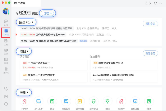 5.然后,再和大家说说怎么使用百度如流的工作流。我们点击“工作流”,进入百度如流的工作台,可以从中预约会议、创建项目任务或者添加一些应用。
