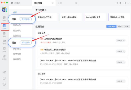 6.比如说可以点击“新建项目”按钮从而创建一个新的项目任务,指定由哪些同事去执行,项目的完成时间等等。也可以点击“新建任务”按钮来新建任务,明确自己待完成的工作内容。