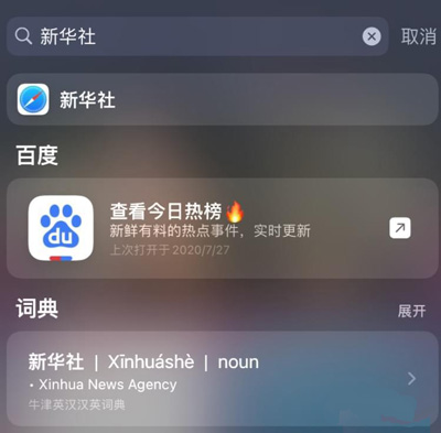 首先,主屏幕上的搜索栏进行了优化,当我们搜索相关信息后,它上面除了会优先出现网络搜索建议之外,它还会显示 Siri 建议、Siri 知识等多个结果。