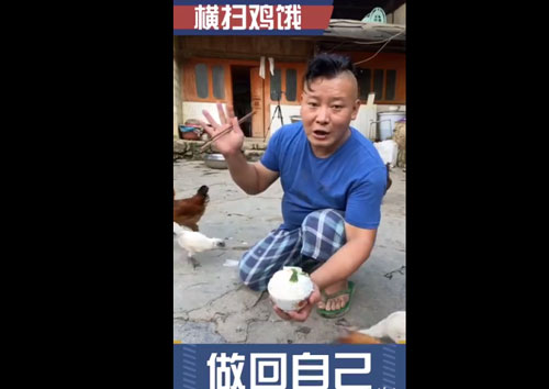 “横扫鸡饿”出自于“诗书达礼之山人”视频博主所拍摄的搞笑视频,在视频中,博主手中拿着的饭,对着镜头说“干饭了、干饭了”,这时他旁边的鸡乘博主不注意,叼走他碗里的菜和肉,随后这个人就会用一记扫堂腿将鸡赶走,被网友称为“横扫鸡饿”;