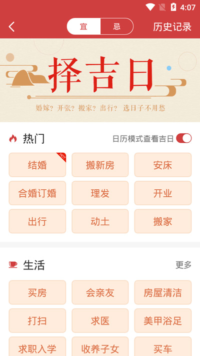 3.然后选择我们需要查看的吉日类别,点击进入查看吉日;