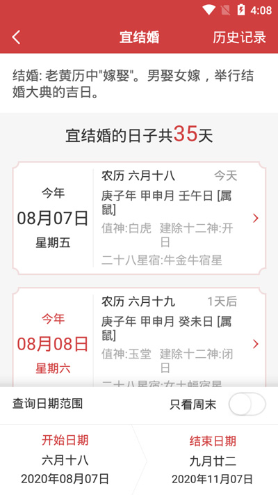 4.以“结婚”为例,点击之后就可以看到宜结婚的日子有多少天,上下滑动查看具体日期,如果需要筛选日期,在下方筛选查询日期范围即可;