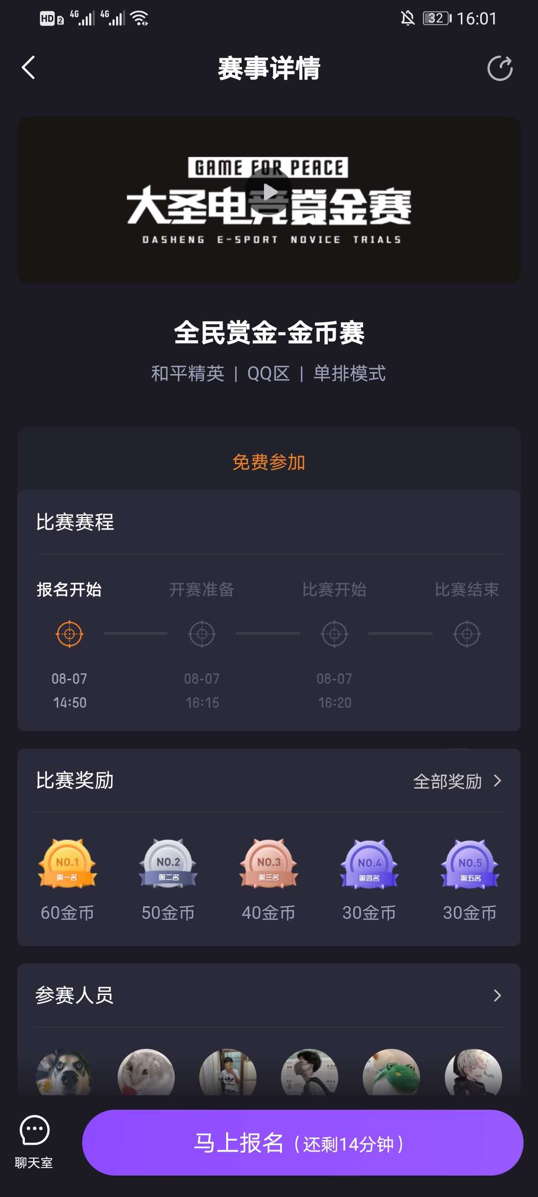 不要钱!只需要通过报名参加全民赏金的金币赛,达到比赛的前五十名就可以获得金币。