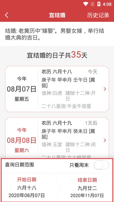 4.进入结婚的黄道吉日页面,点击下方选择【查询日期范围】;