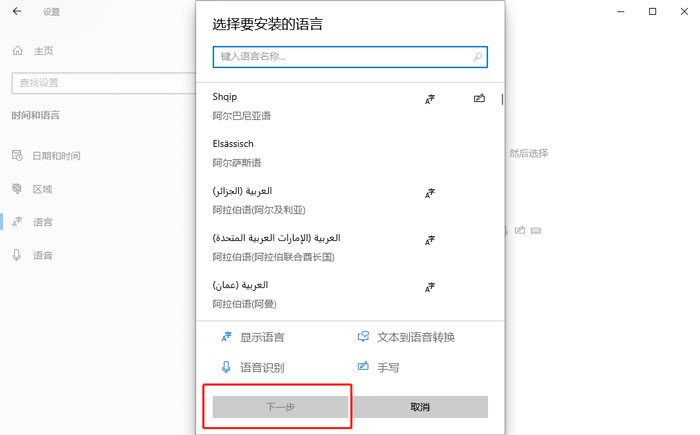 4、之后在列表中选择我们需要添加的语言,完成之后点击【下一步】,如图;