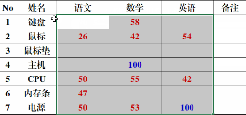 1、打开Excel表格,任意导入或输入一个数据表格,为了便于演示这里以成绩单表格为例来说明,首先选中所有需要标记颜色的单元格数据(这里指所有的成绩)。