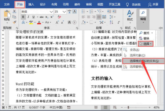 2.然后,点击“开始”菜单中的“编辑”,并在其下拉菜单中点击“选择”中的“选择格式相似的文本”,word便会将所有一级标题选中。