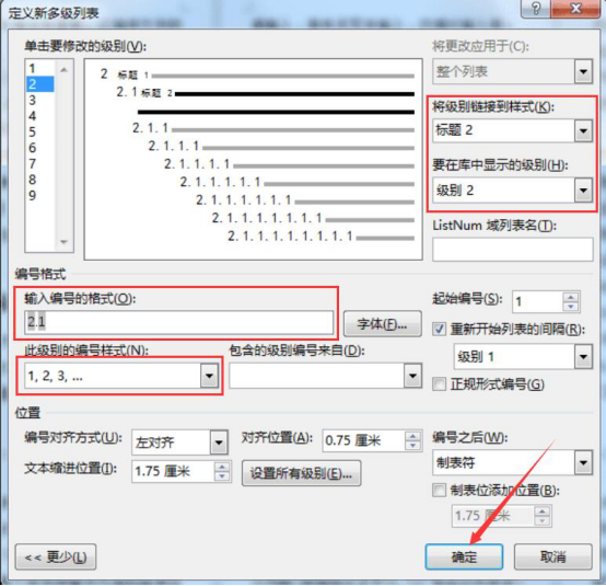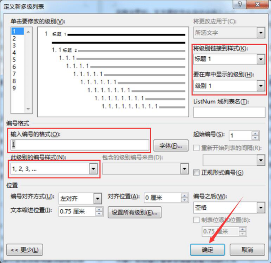 4.弹出的多级列表窗口中,设置输入编号的格式、样式、级别等等,之后,点击“确定”按钮,word的一级标题样式便设置成功。