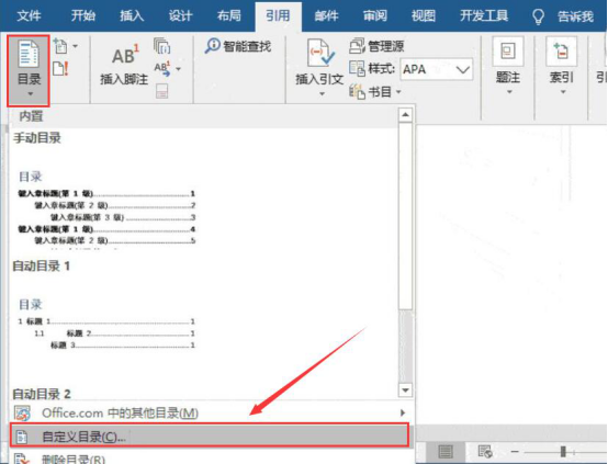 7.再点击“引用”菜单中的“目录”。在目录的界面中,点击“自定义目录”。