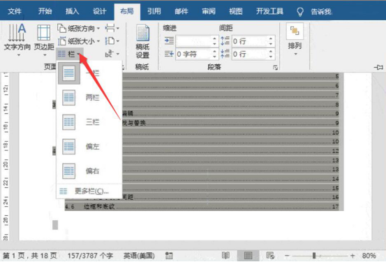 8.word目录生成后,点击word“布局”菜单中的“栏”,从其下拉菜单中点击“两栏”,也可以根据你自己的需要,设置为三栏,或者更分级。
