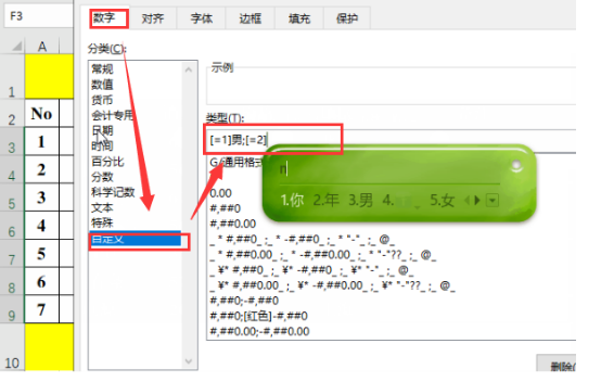 注意: “[=1]男;[=2]女”中的“1”、“2”为简易代码。